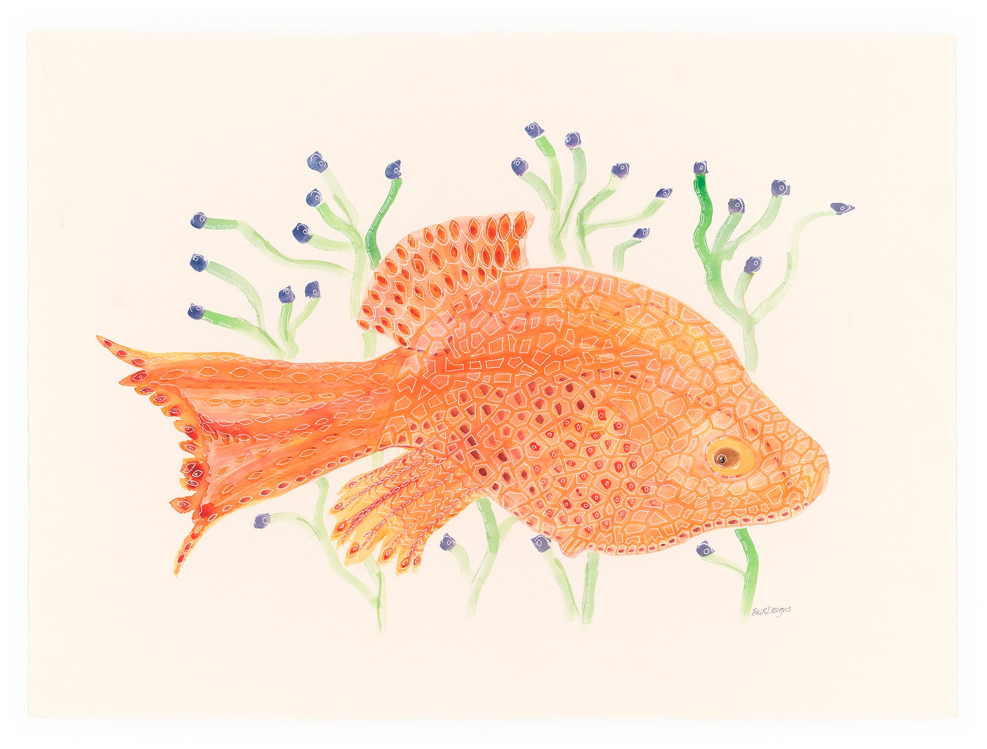 This original watercolour painting on 365gsm archival paper features an orange fish adorned with delicate patterns, gracefully gliding through slender green reeds. Soft washes of colour and gentle movement evoke a sense of calm and quiet wonder beneath the water’s surface.