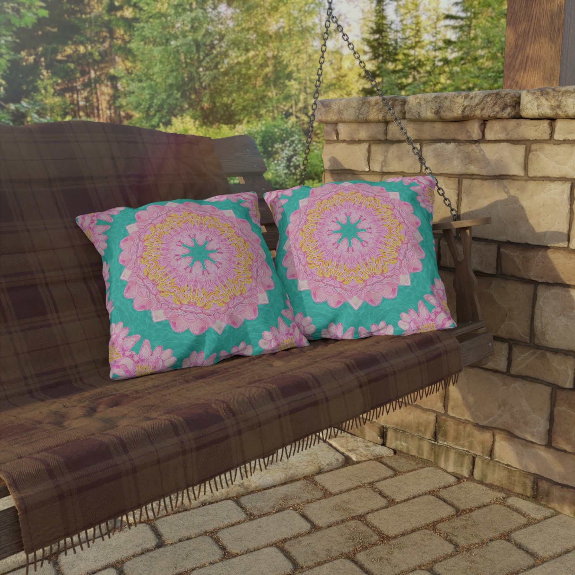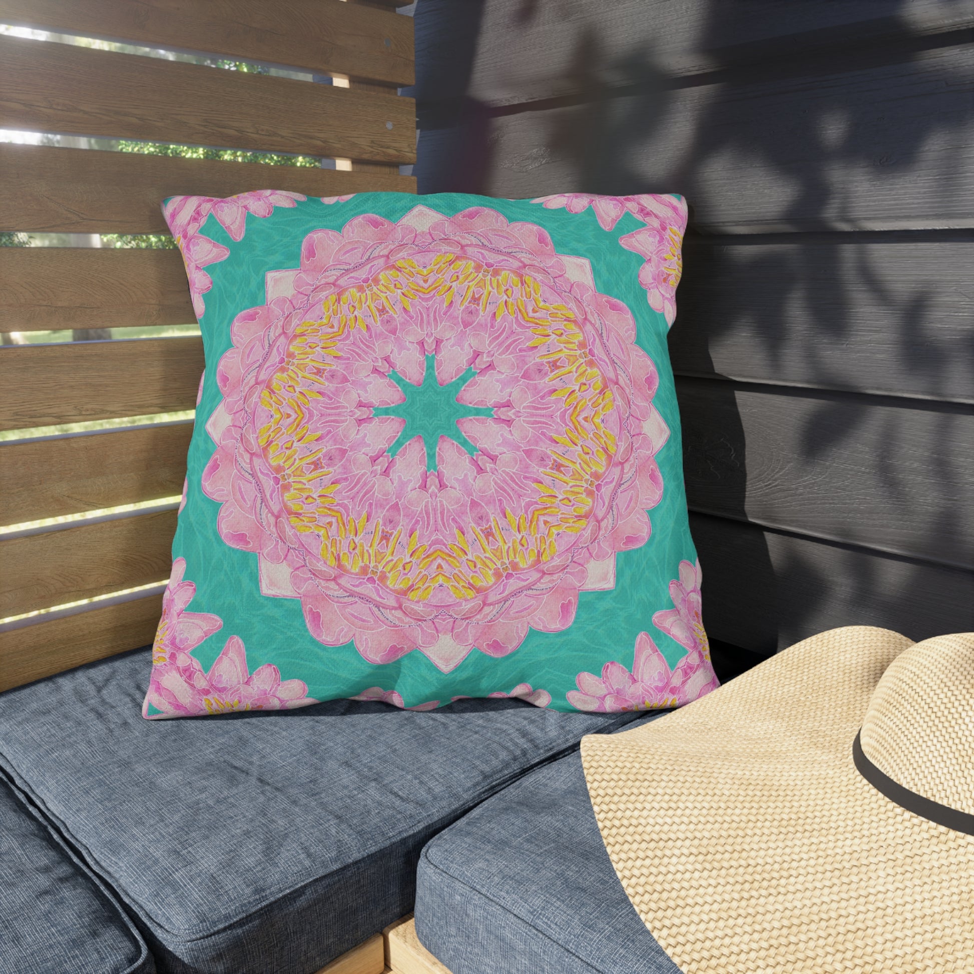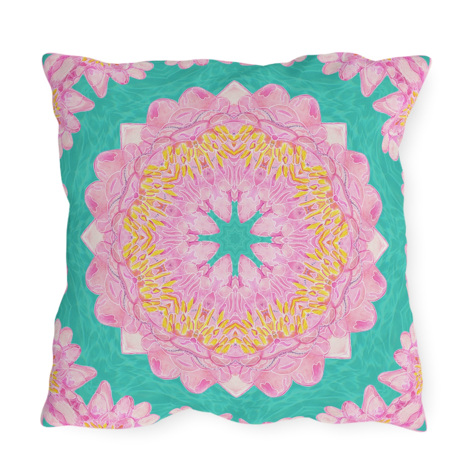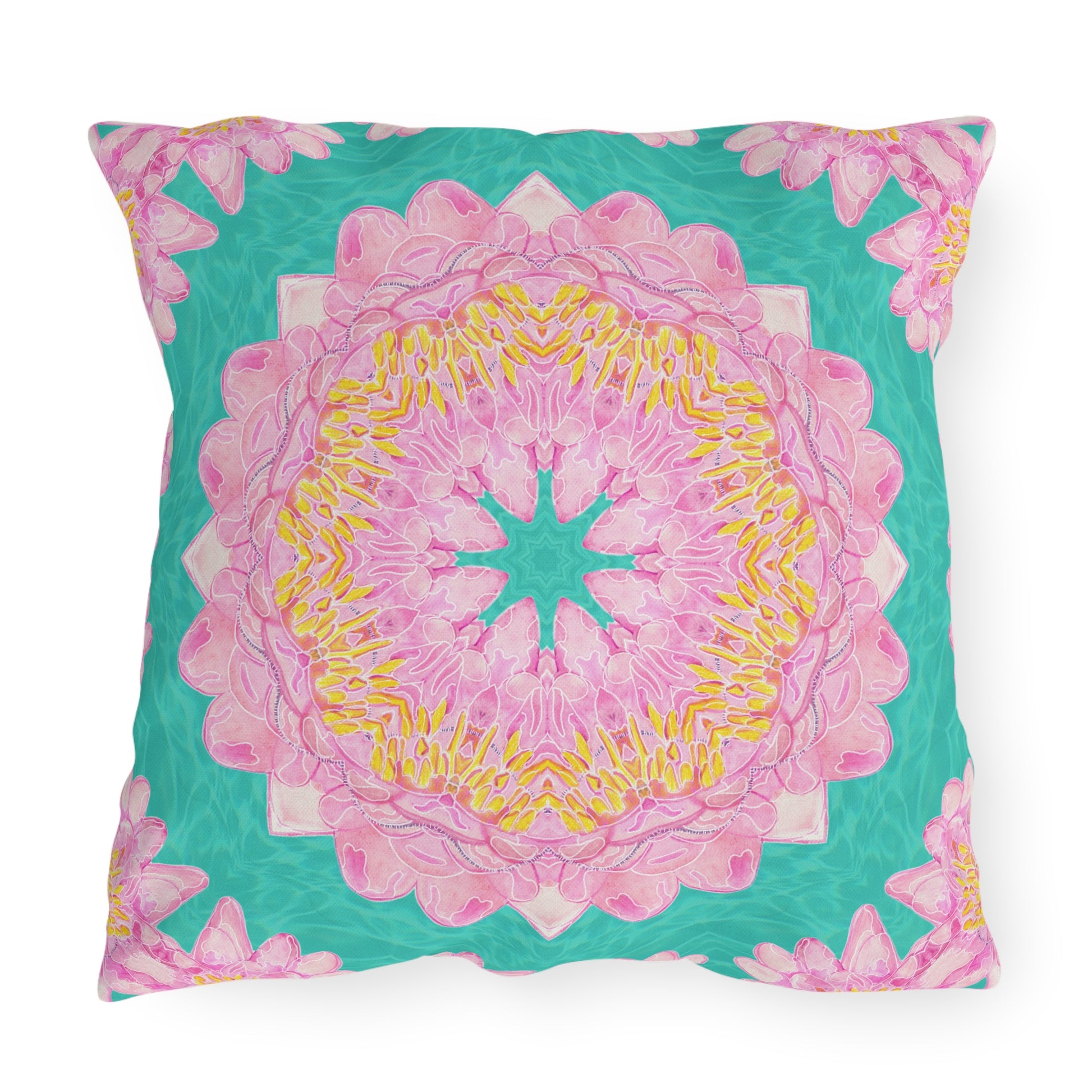 Outdoor Cushion with Pink Water Lily Pattern on a Turquoise Background