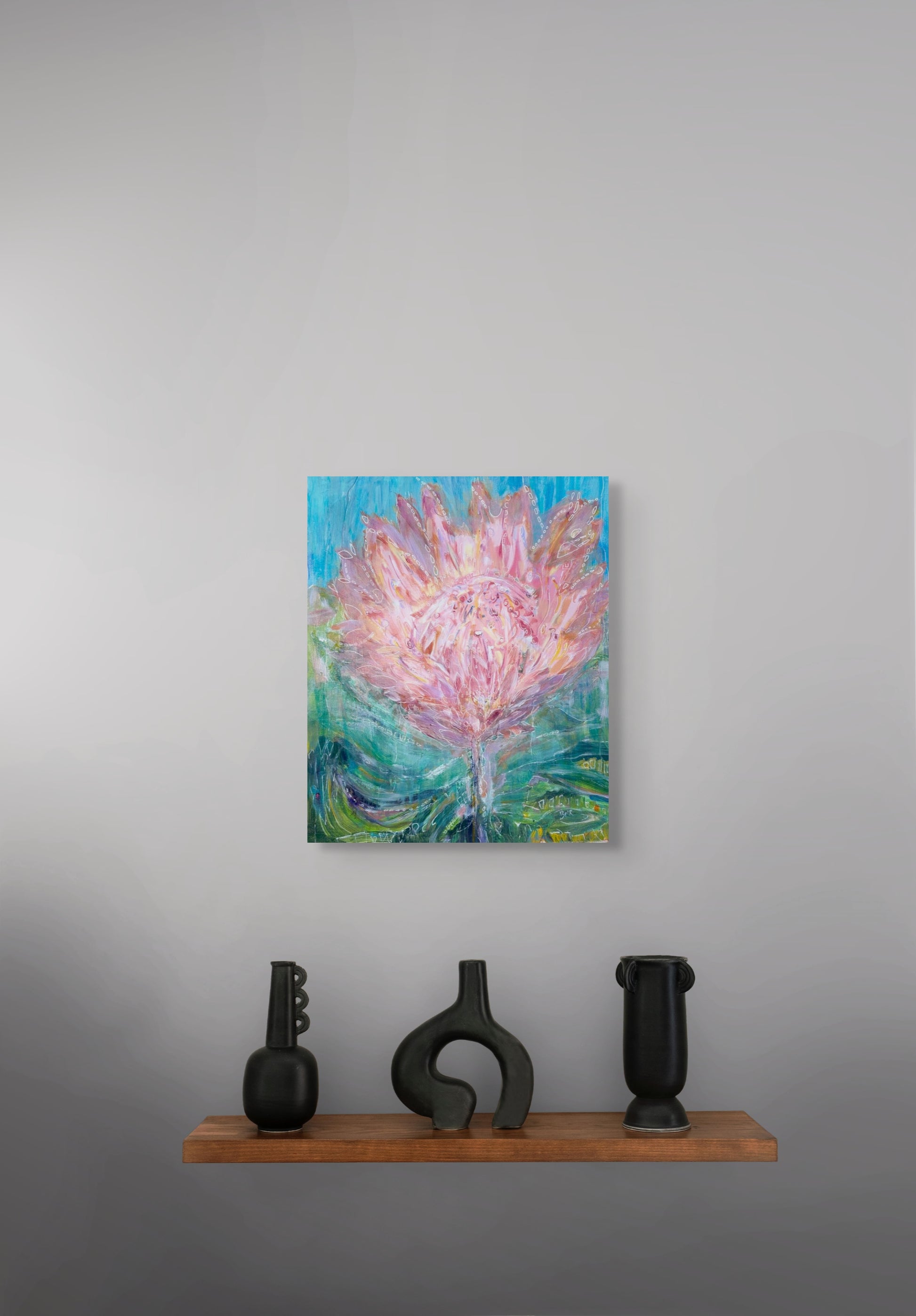 This original multimedia painting on archival canvas of a protea bursts with apricot and mauve tones, set against a lush, layered green background. The bloom is adorned with delicate white ink detailing, tracing intricate patterns across its petals and adding a sense of movement and depth. The contrast between the soft, warm hues of the flower and the vibrant greenery creates a striking composition. The painting is ready to hang and has been varnished for protection.