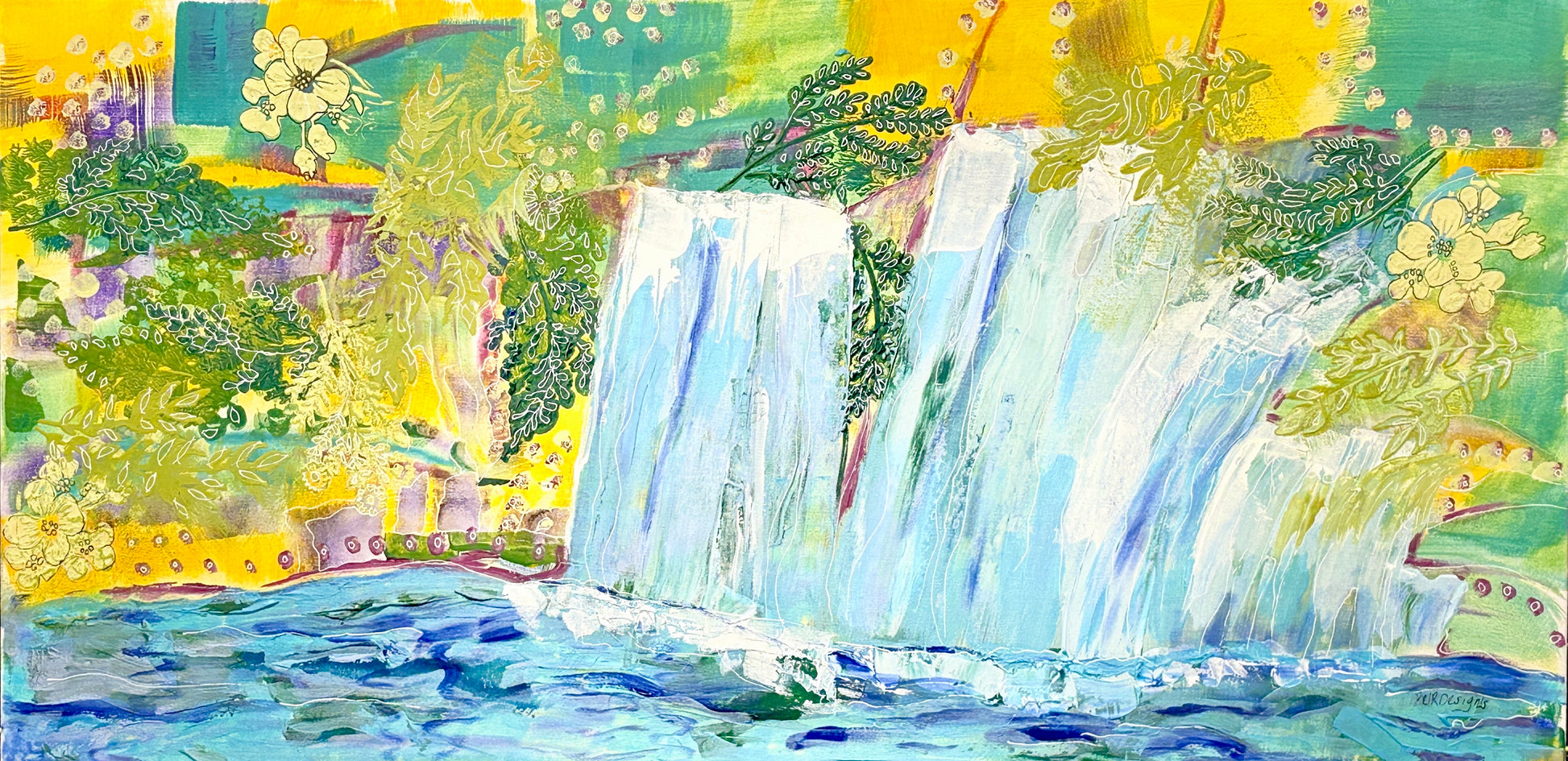 Experience the serene beauty of nature with "Waterfall Wonder 2", a mixed media artwork on archival canvas. Measuring 40.6 cm (H) by 81.28 cm (W) with a depth of 4 cm, this ready-to-hang artwork captures a lush rainforest scene where flora peeks through multiple cascading waterfalls. Its intricate details invite you to explore the calming atmosphere, making it a stunning centrepiece that transforms any room into a tranquil escape.